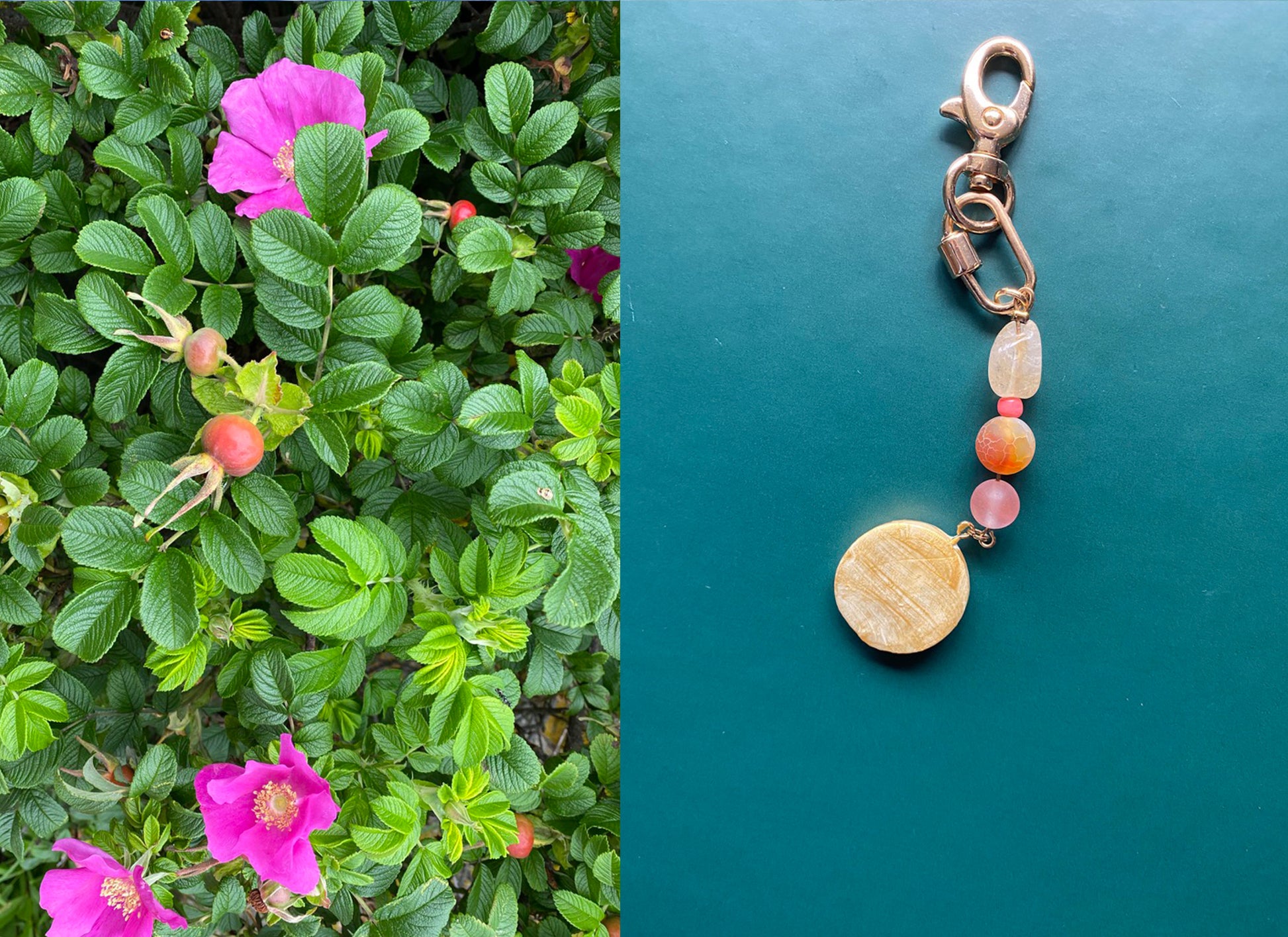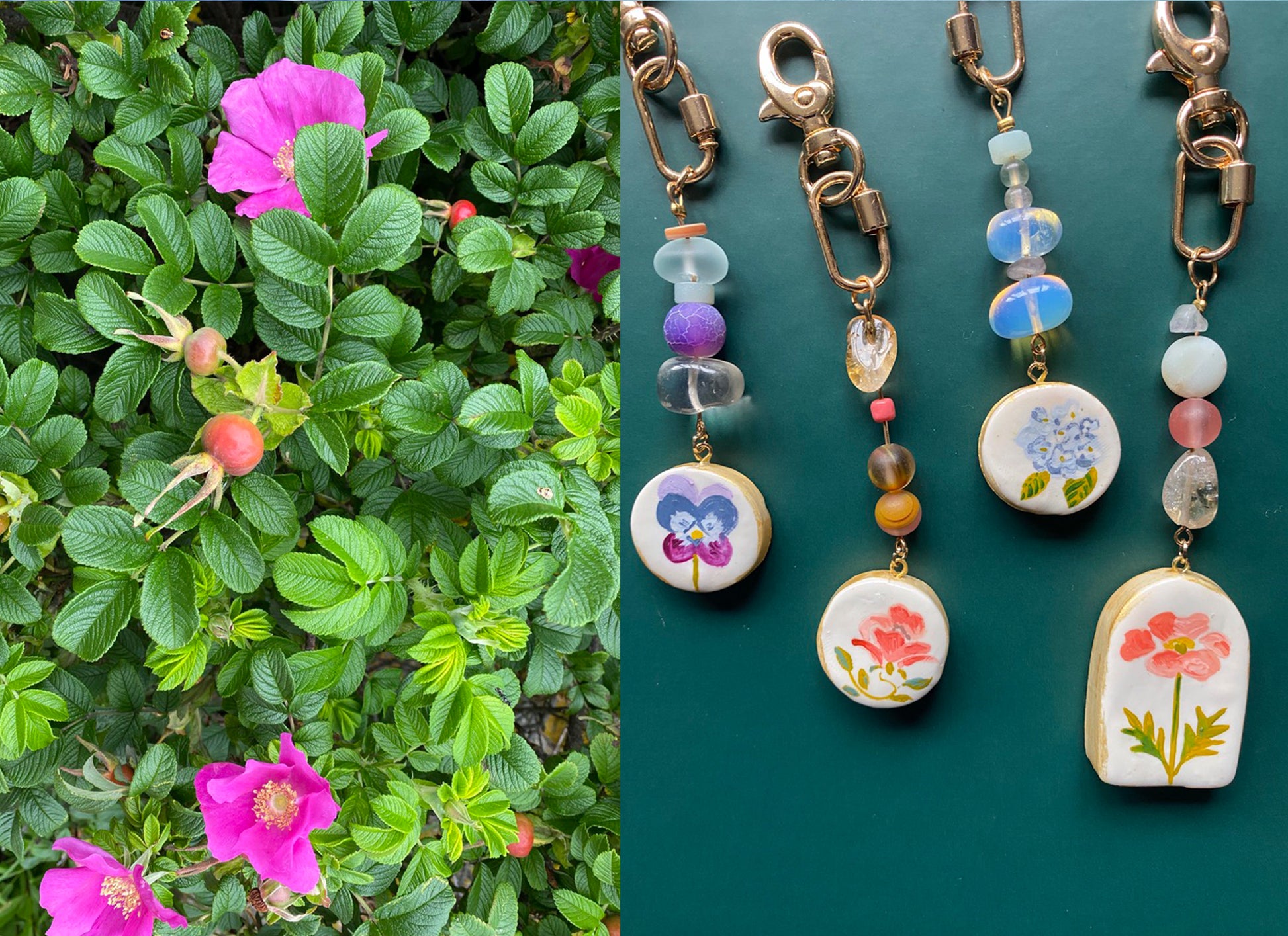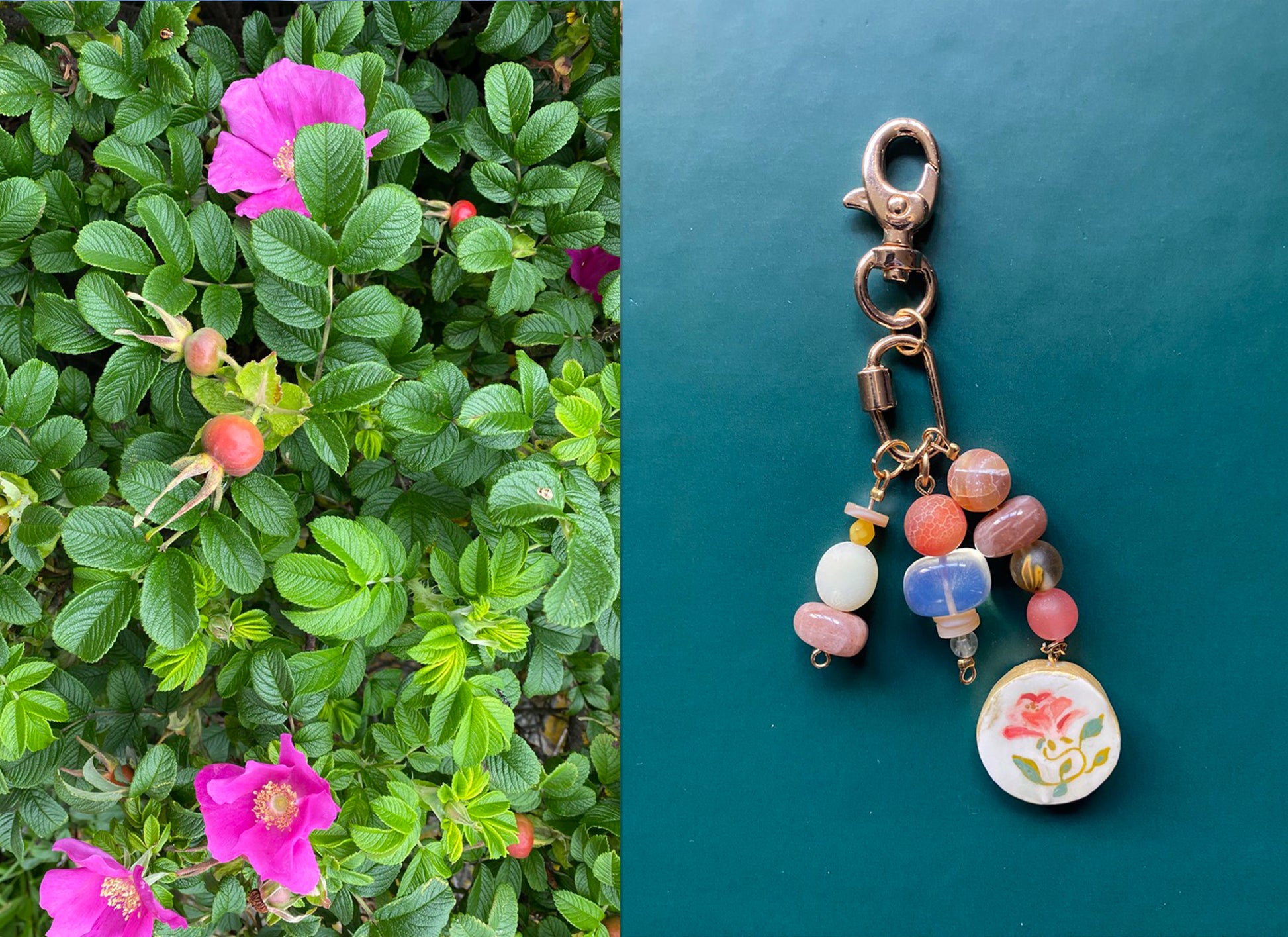 Our illustrated Beach Rose bag charm is inspired by the roses that populate the Maine shoreline each summer. The beach rose charm is hand-painted and sealed for durability with a combination of unique beads for a playful design that can be dressed up or down.