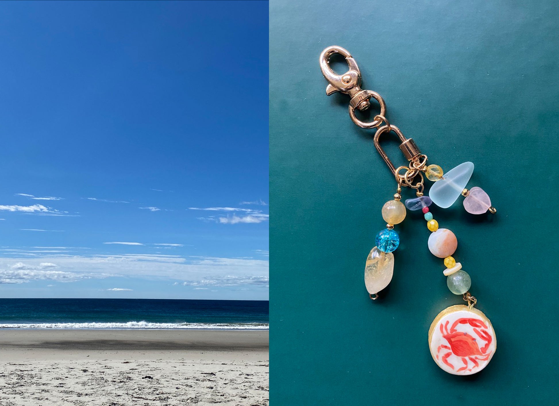 Our illustrated Crab bag charm is inspired by the colors of the shore. The crab is hand-painted and sealed for durability with a combination of unique beads for a playful design that can be dressed up or down.