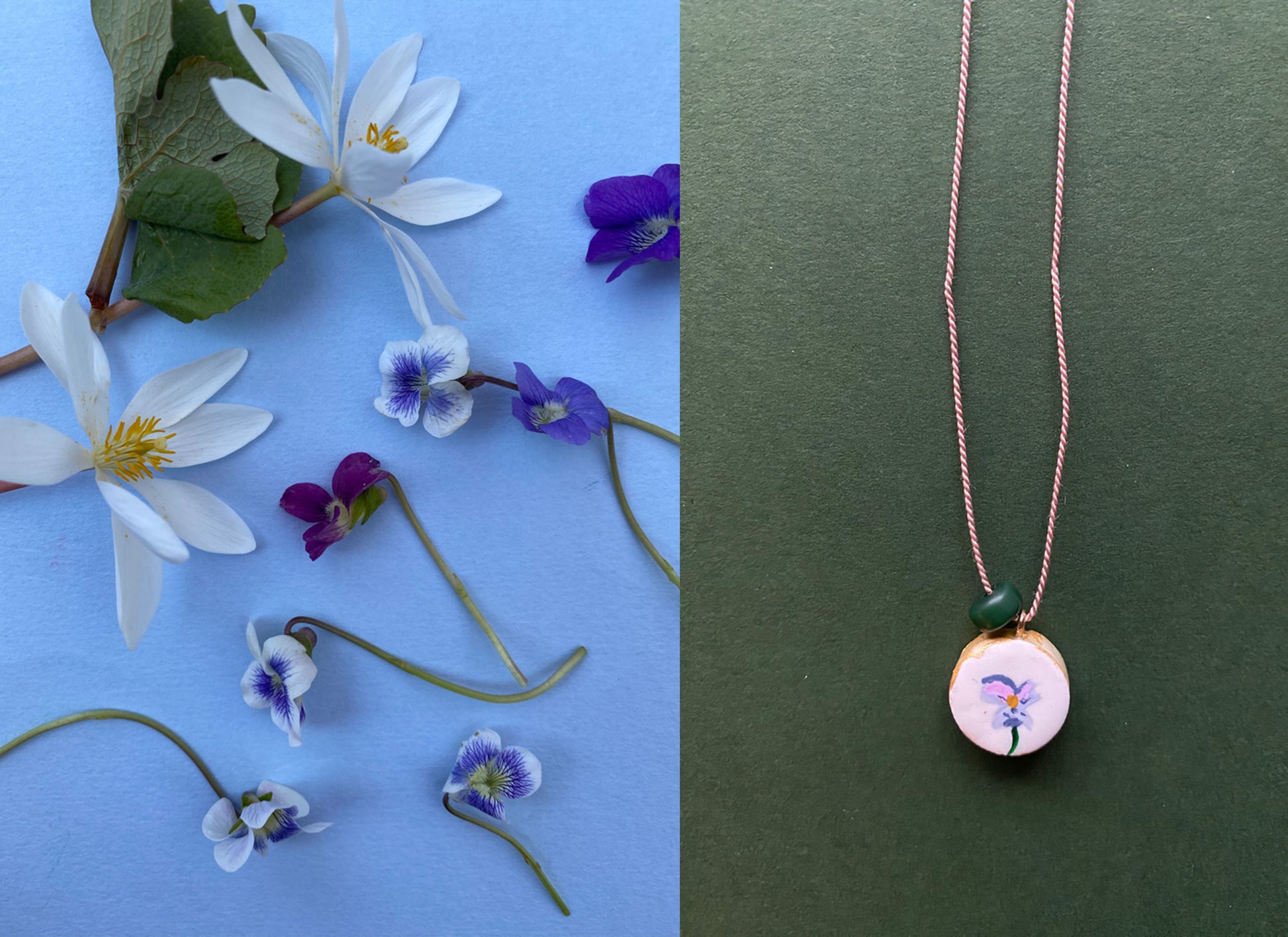 Our Illustrated Pansy silk necklace is inspired by the mighty garden flower that comes up in early spring. The pansy charm is hand-painted and sealed for durability with bead for a playful design that can be dressed up or down.