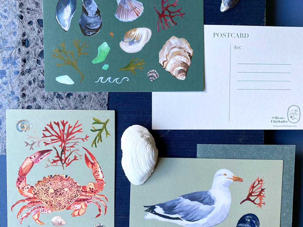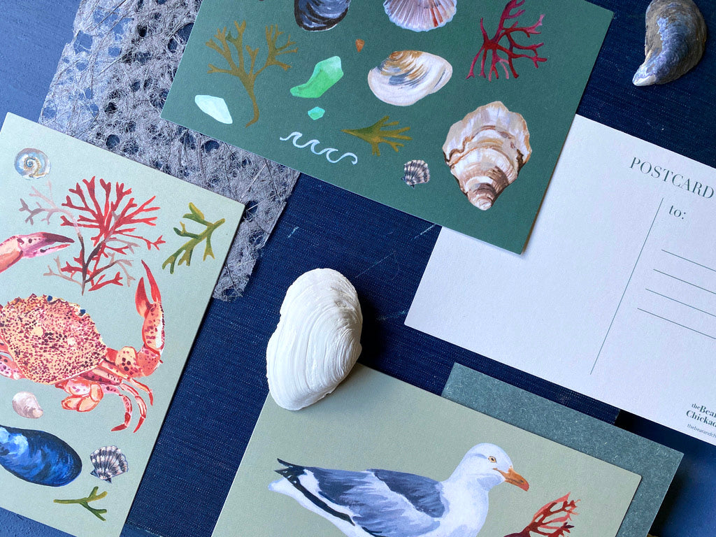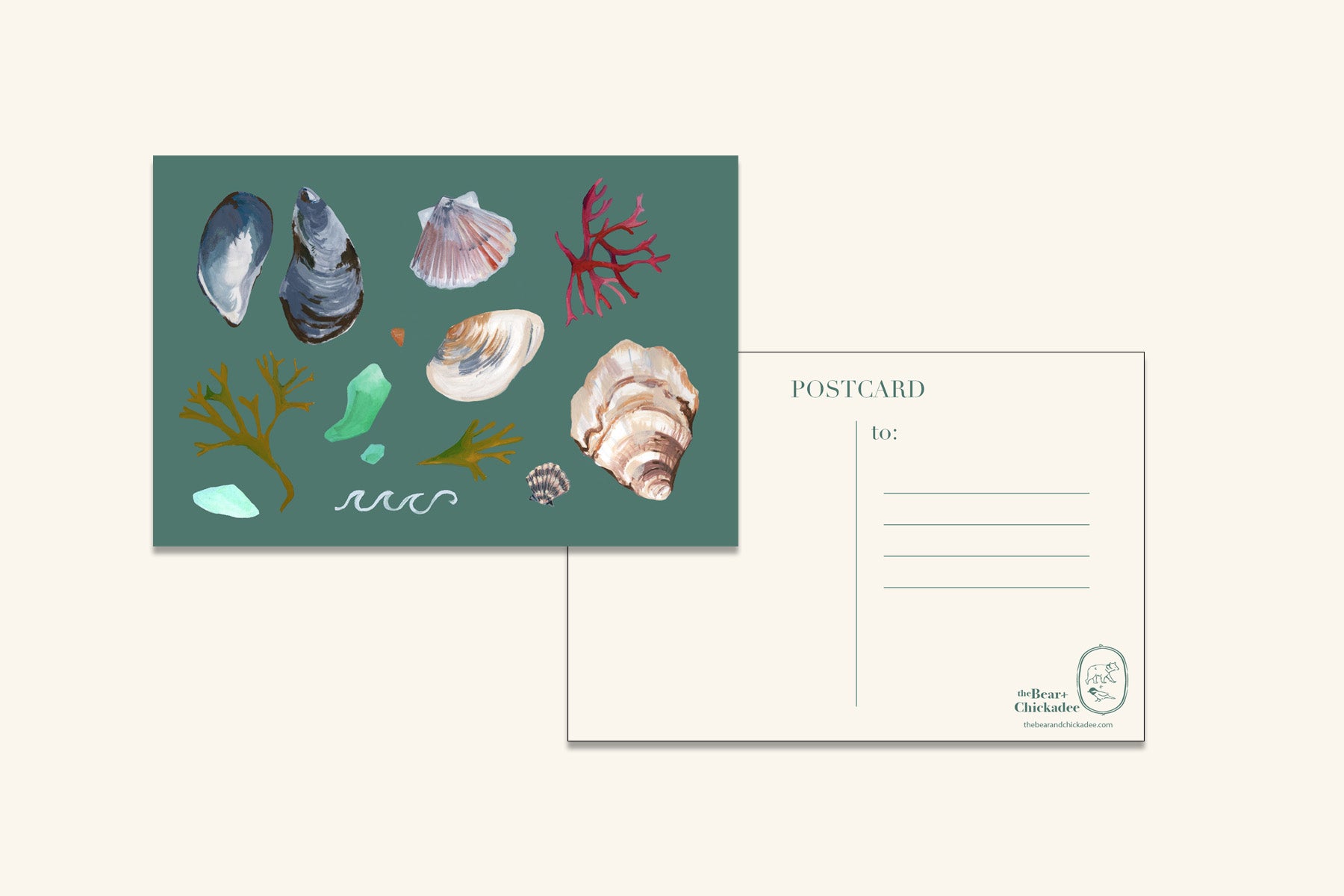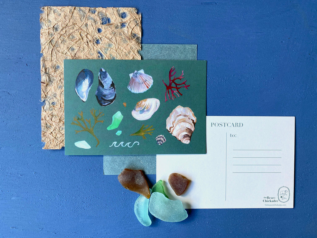Find a beach umbrella and send a note to someone special with this post card that celebrates collected beach finds.